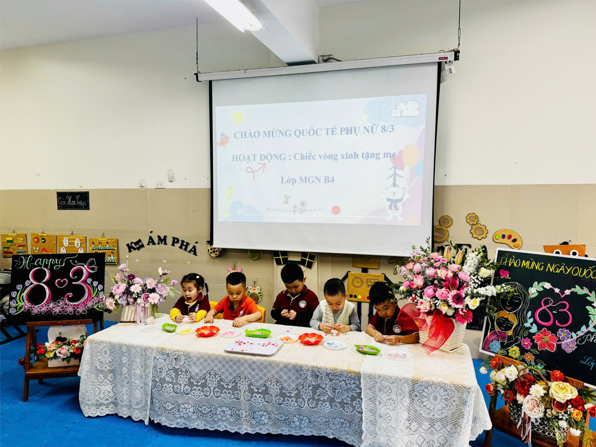 ,Các bé nhóm 4 lớp MGN B4 rất vui khi được xâu vòng tặng mẹ ngày 8/3
