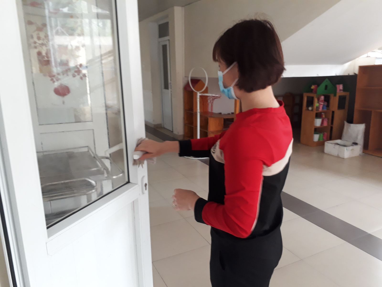 Để chuẩn bị chào đón các bé quay trở lại trường học sau khi nghỉ tết nguyên đán 2021 và nghỉ phòng chống dịch bệnh Covid 19, Ban Giám Hiệu trường Mầm non Gia Thượng thường xuyên tổ chức các buổi lao động, dọn vệ sinh phòng chống dịch bệnh trong nhà trường. Các cô giáo lớp Mẫu giáo bé C3 cũng luôn đề cao tinh thần phòng dịch, tham gia lao động dọn vệ sinh, lau chùi phòng học, phòng chức năng. Đặc biệt là tay nắm cửa, bàn, ghế, đồ dùng đồ chơi và những nơi trẻ thường xuyên tiếp xúc bằng dung dịch khử khuẩn.