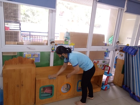 Cá !important;c tủ đồ chơi, cánh cửa được các cô lau dọn sạch sẽ bằng dung dịch sát khuẩn Cloramin B