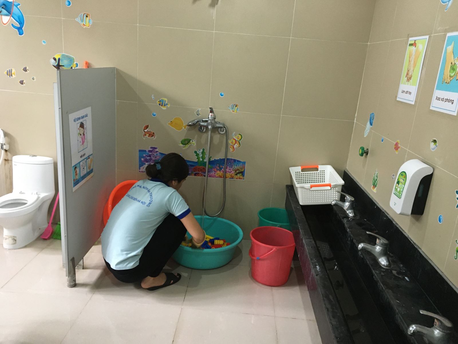 Đồ chơi của trẻ được rửa bằng dung dịch clominb.