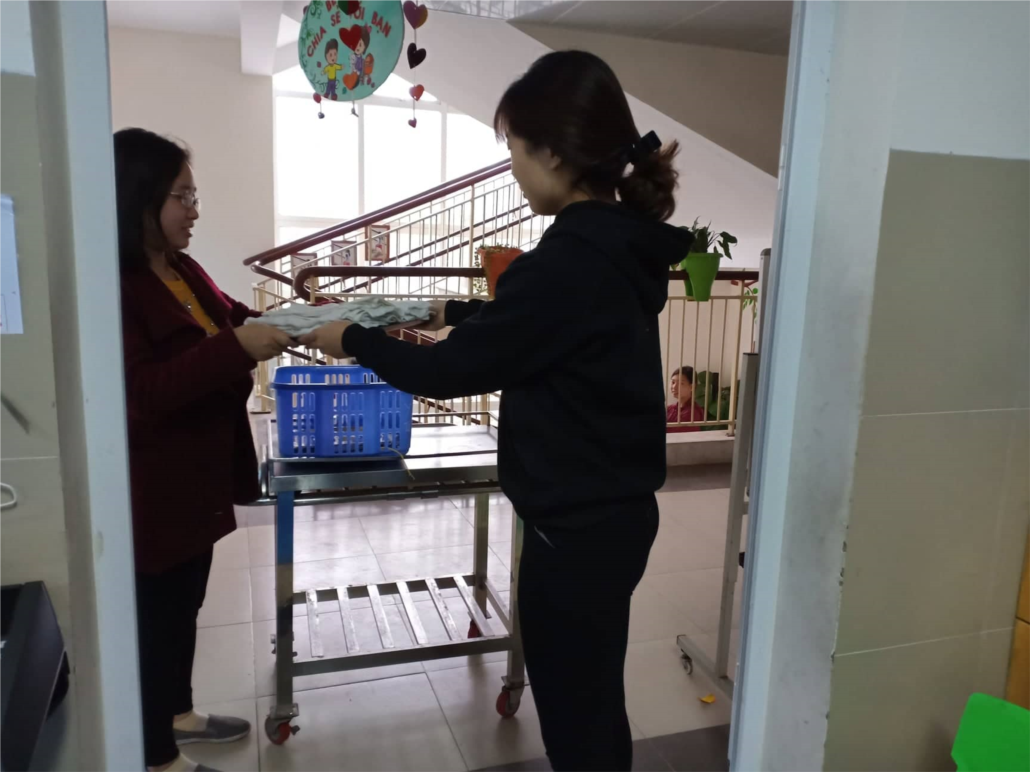 Nhân viên y tế đi thu khăn của trẻ để mang đi hấp nóng