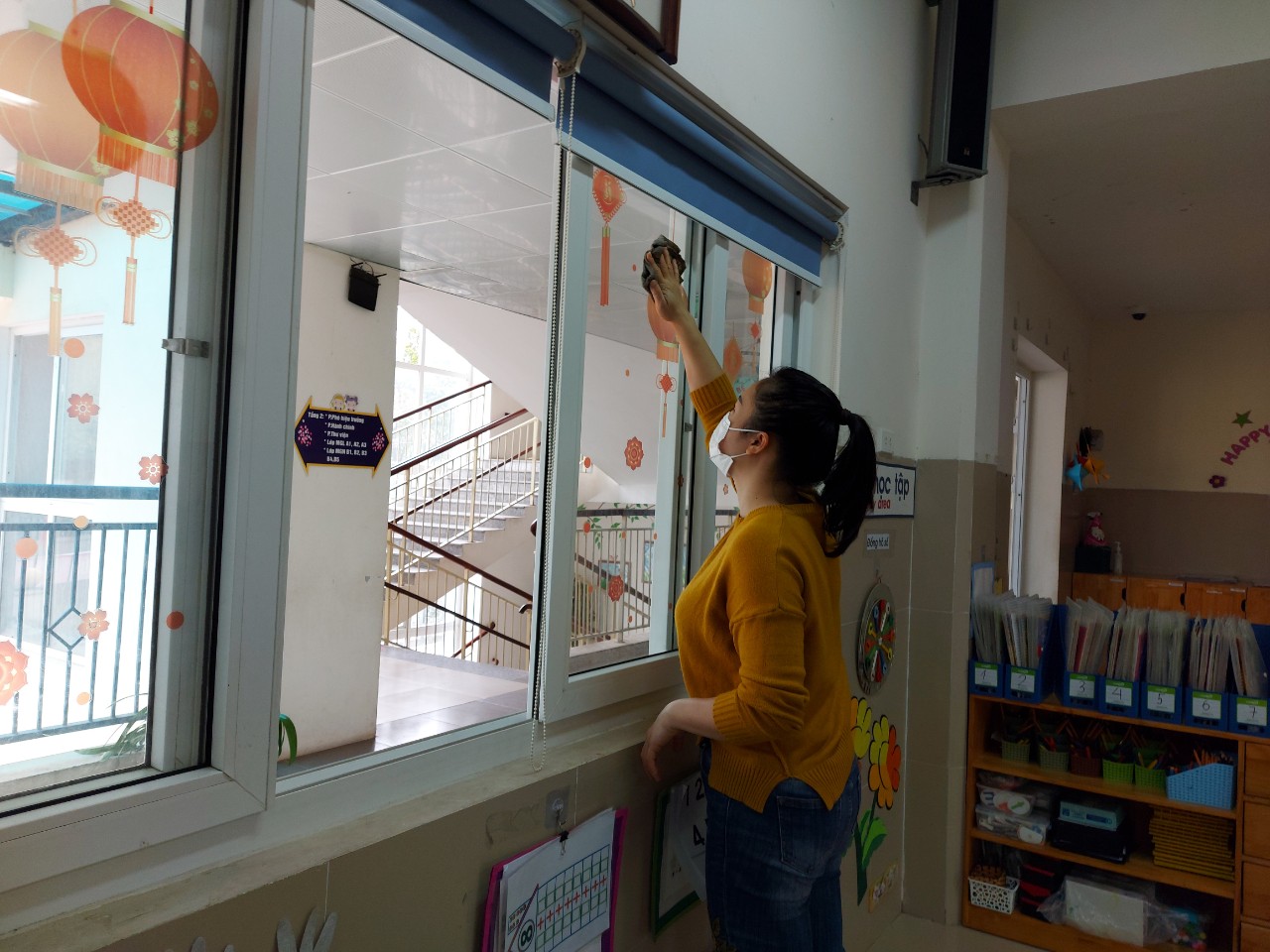 Giáo viên lớp lau chùi toàn bộ các giá đồ dùng và vệ sinh đồ chơi, đồ dùng của trẻ.