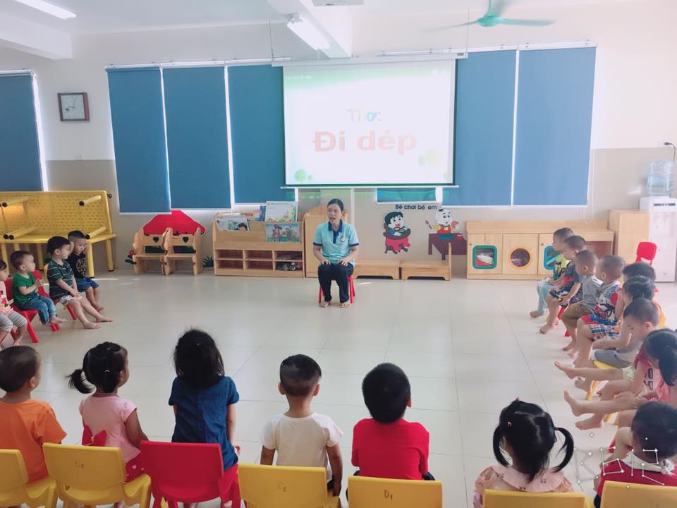 Đến với nhà trẻ D1 các bạn được học tiết phát triển ngôn ngữ, bài thơ: " Đi dép" của nhà thơ Phạm Hổ. Trước giờ học các bạn hát cùng cô theo nhạc bài hát: " Đôi dép" để các bạn hào hứng vào tiết học.