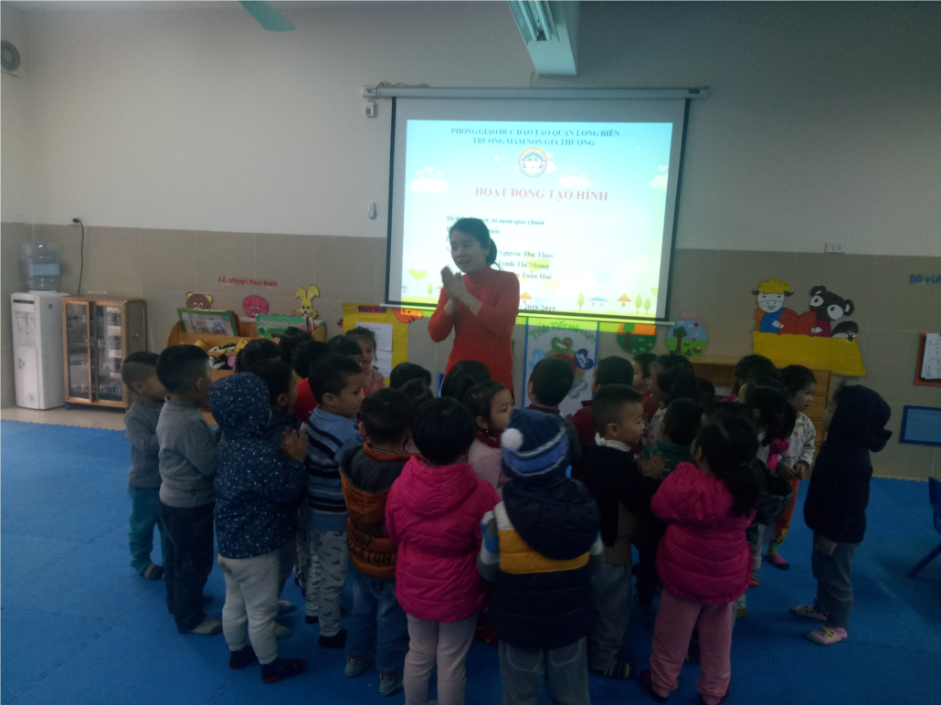 Cô và trẻ cùng hát bài: " Quả cam, quả chuối"