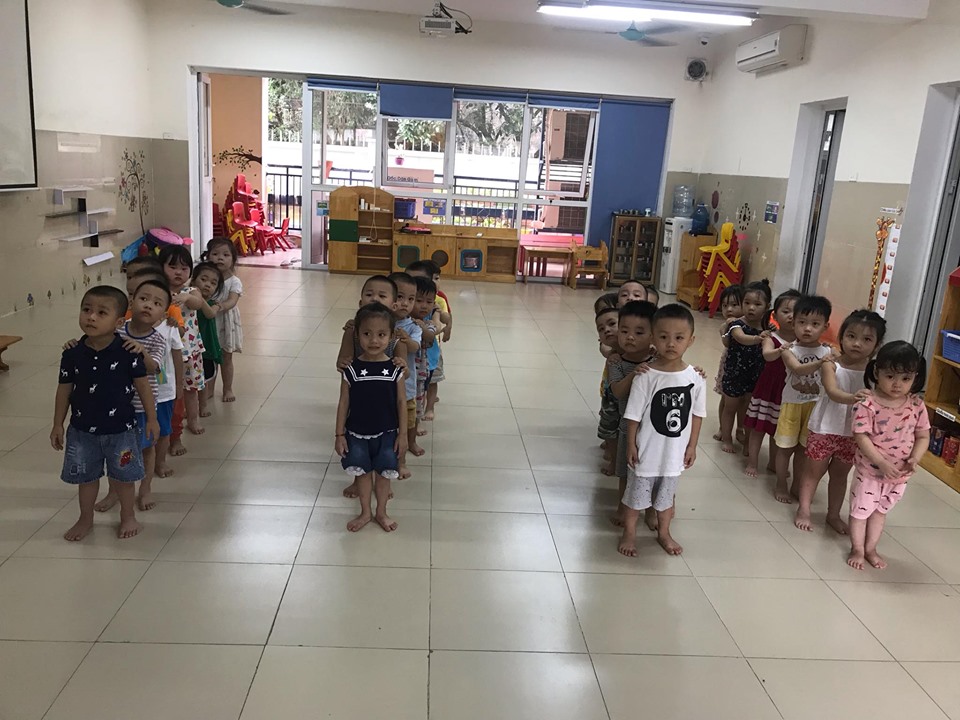Cả lớp xếp hàng chuẩn bị vào rửa tay.