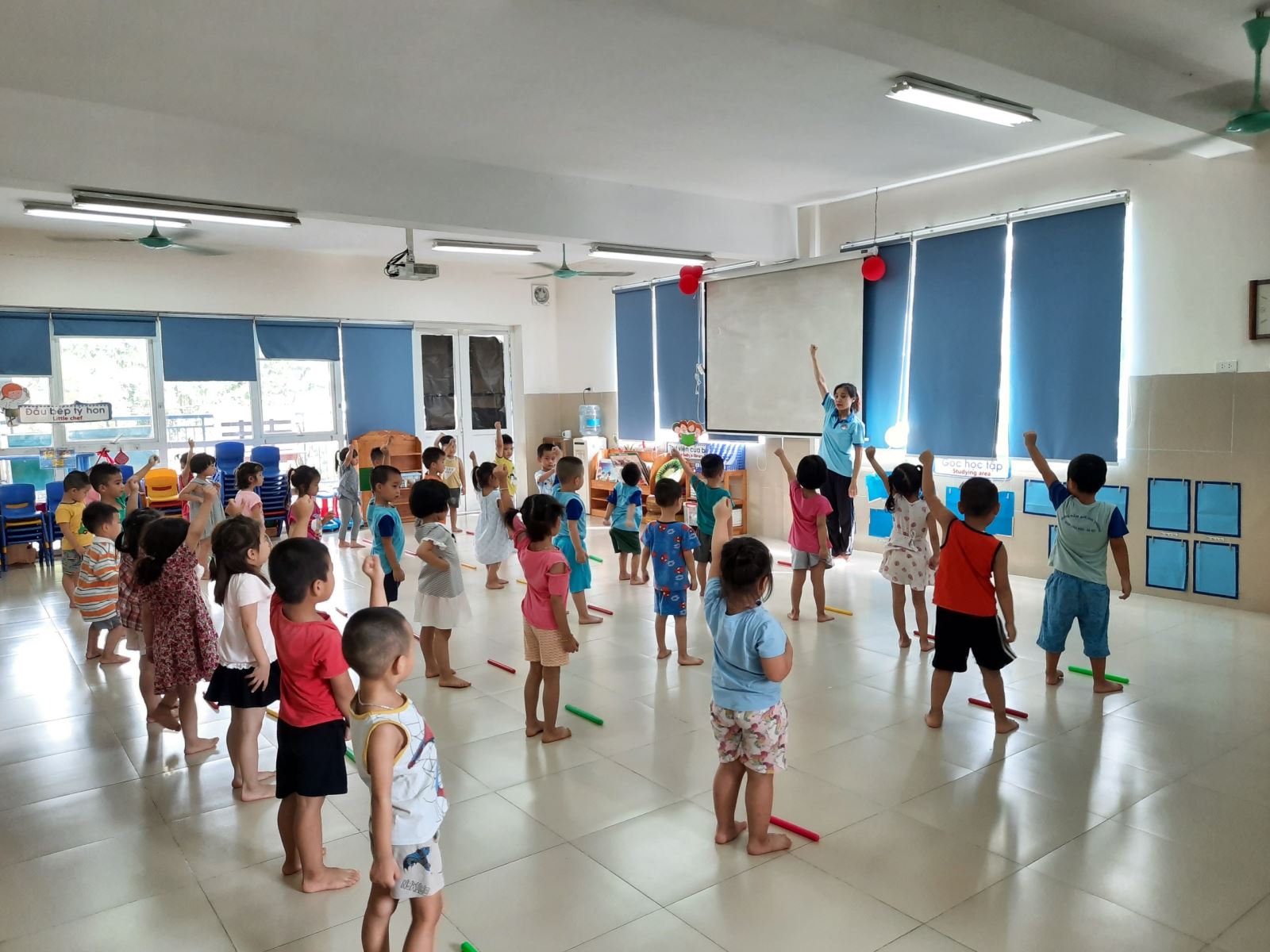 Trẻ tập các động tác với gậy thể dục