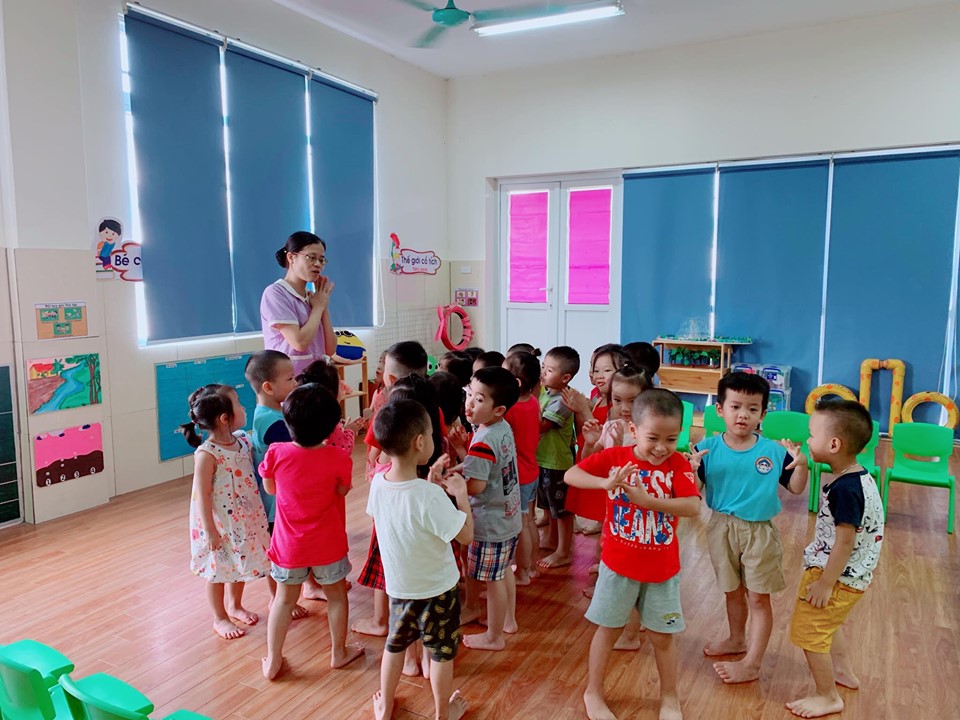 Bạn nhỏ nào cũng hăng say lắng nghe cô Liễu hát bài hát:" Trường Mầm non Gia Thượng mến yêu"