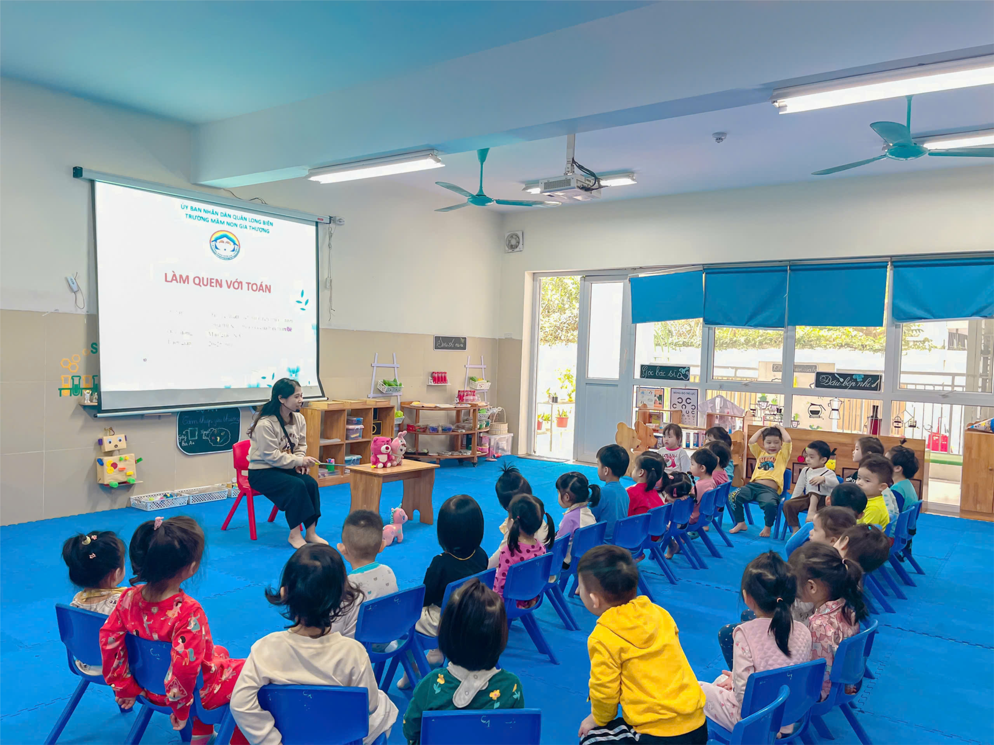 Toán giúp trẻ phát triển trí tuệ, tư duy, sự ghi nhớ và hình thành khả năng nhận thức thế giới xung quanh, rèn luyện các thao tác tư duy, so sánh, phân tích, tổng hợp, khái quát. Trong các giờ hạt động làm quen với toán, giáo viên giúp trẻ thực hiện một số thao tác, kỹ năng như kỹ năng xếp tương ứng 1-1, kỹ năng sắp xếp theo quy tắc, kỹ năng đếm, thêm bớt, định hướng trong không gian...ngoài ra giáo viên còn tổ chức cho trẻ trải nghiệm với các đồ dùng đồ chơi tự tạo để trẻ phát triển tư duy và trí tuệ.. với nhiều hình thức đổi mới , hiện đại, phong phú đa dạng, giáo viên đã giúp trẻ lĩnh hội kiến thức một cách thoải mái “ Chơi mà học học mà chơi”.