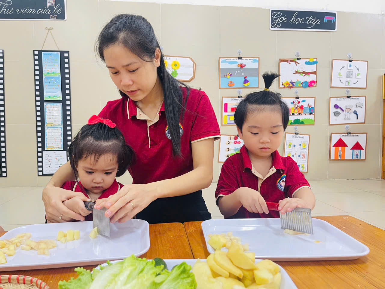 Bé Minh Khang và Bảo Anh đang rất chăm chú khi sử dụng dao!