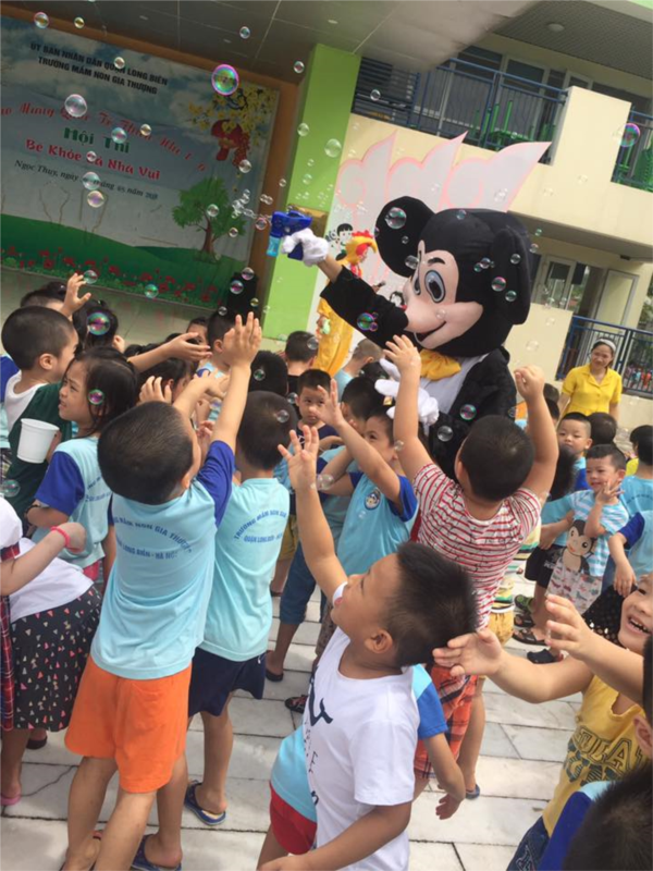 Các bạn nhỏ được tập trung dưới sân trường để đón chào bạn Micky, bạn Gà trống, chú hề và các bạn được các cô chuẩn bị cho rất nhiều đồ dùng để thổi bong bóng đấy. Bạn nào cũng rất vui khi tạo ra những bong bóng có rất nhiều màu sắc lấp lánh.