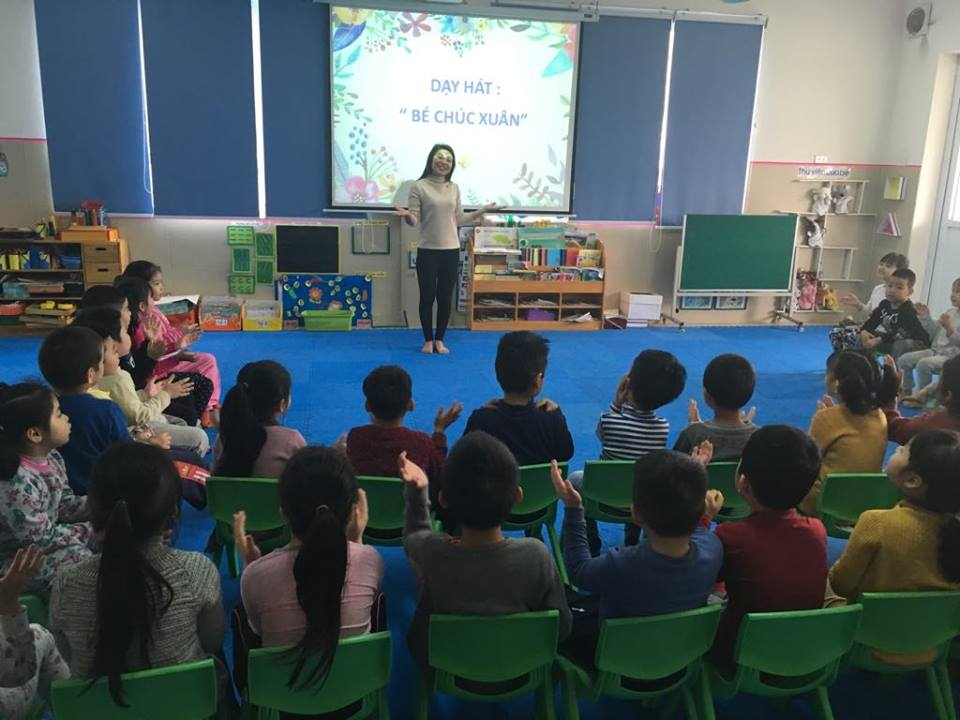 Tiếp theo sẽ là phần mà cả lớp mong đợi nhất, đó là phần trò chơi âm nhạc. Cô Hường mang đến cho lớp mình 1 trò chơi rất hay đó là " Xướng âm theo đàn". Nhiệm vụ của các bạn nhỏ sẽ là lắng nghe cô đánh đàn 1 số bài hát trong chủ điểm và hát âm "la" theo giai điệu của đoạn nhạc đó.