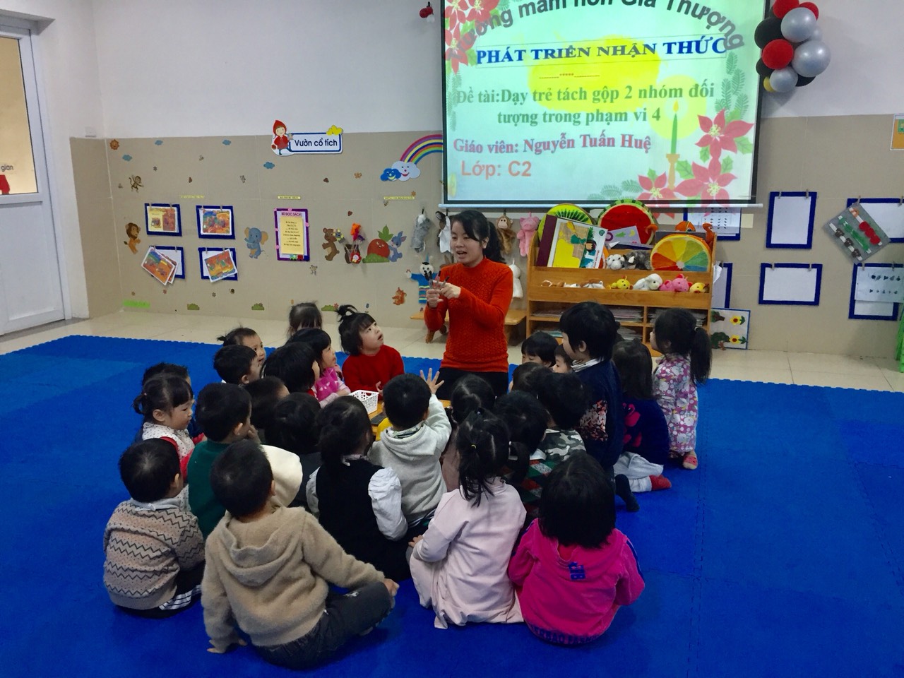 “Toán học” theo nhận thức chung của mọi người là khó. Vì vậy để “học” được “nó” lại càng khó hơn. Đối với trẻ Mầm non “Toán học” đóng vai trò quan trọng trong cuộc sống hàng ngày của trẻ, giúp trẻ nhận thức được thế giới xung quanh, trong các mối quan hệ về số lượng, con số, phép đếm. “Toán học” còn giúp trẻ phát triển về mọi mặt, trí tuệ, tư duy lôgic, tư duy trực quan... và một số thói quen cẩn thận, chính xác, tạo cơ sở ban đầu cho trẻ tiếp xúc, lĩnh hội các kiến thức về toán, góp phần phát triển toàn diện cho trẻ. Chính vì vậy, hnay cô và trò lớp MGB C2 cùng nhau học LQVT: tách gộp @ nhóm đối tượng trong phạm vi 4: