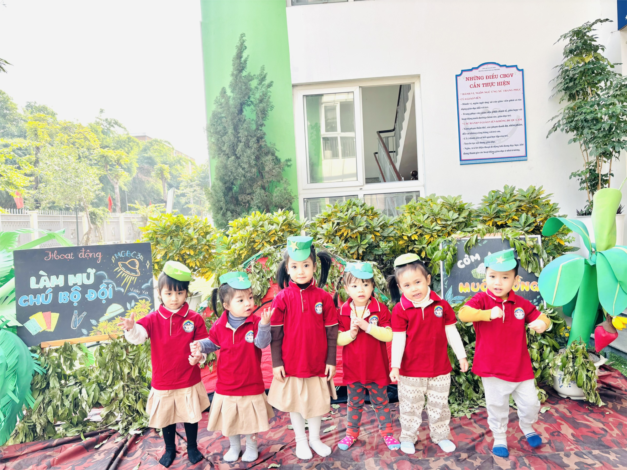 Hòa cùng không khí cả nước chào mừng 80 năm ngày thành lập Quân đội nhân dân Việt Nam 22.12.1944 - 22.12.2024. Hôm nay cô trò lớp MGB - C3 tổ chức hoạt động đầy ý nghĩa, nhằm đẩy mạnh hoạt động giáo dục cho trẻ theo định hướng phát triển toàn diện phẩm chất và năng lực, gắn với định hướng nghề nghiệp. Nhằm giáo dục truyền thống yêu nước, lòng tự hào dân tộc, tình yêu thương, kính trọng các chú bộ đội và khơi dậy ước mơ của bé lớn lên sẽ trở thành những chú bộ đội bảo vệ tổ quốc. Đồng thời tăng cường sự phối hợp giữa nhà trường, gia đình và xã hội, tạo môi trường thuận lợi để giáo dục kỹ năng sống và hoạt đông giáo dục cho trẻ mầm non. Để giúp trẻ hiểu hơn về ý nghĩa của ngày thành lập quân đội nhân dân Việt Nam 22/12 cũng như dành tình cảm yêu quý, biết ơn các cô chú bộ đội. Cô và trò lớp MGB - C3 đã cùng nhau tham dự hoạt động'' Học kỳ quân đội'' làm mũ tặng chú bộ đội. Sau đây là những hình ảnh của các bé lớp MGB - C3.