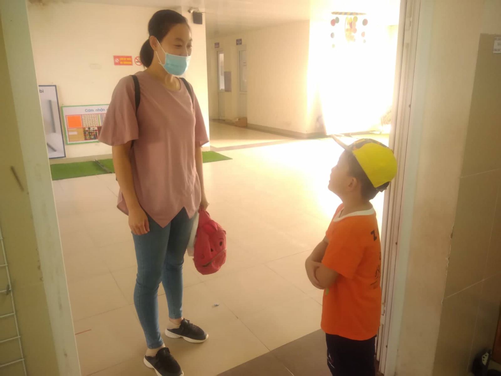 Bạn Chí Thành khoanh tay chào mẹ trước khi vào lớp học.