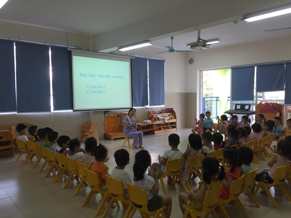 Hiểu được tầm quan trọng của việc giáo dục âm nhạc cho trẻ, các cô giáo luôn vận dụng, thiết kế các bài giảng, tìm hiểu các phương pháp mới giúp trẻ luôn hứng thú trong giờ học, tạo cho trẻ không gian học thoải mái mà hiệu quả cao. Đến với tiết âm nhạc của các bé lớp MGN B3, các bé được hòa mình trong không khí của những ngày đầu đến trường với bài hát “Vui đến trường”, nghe hát “Ngày đầu tiên đi hoc".