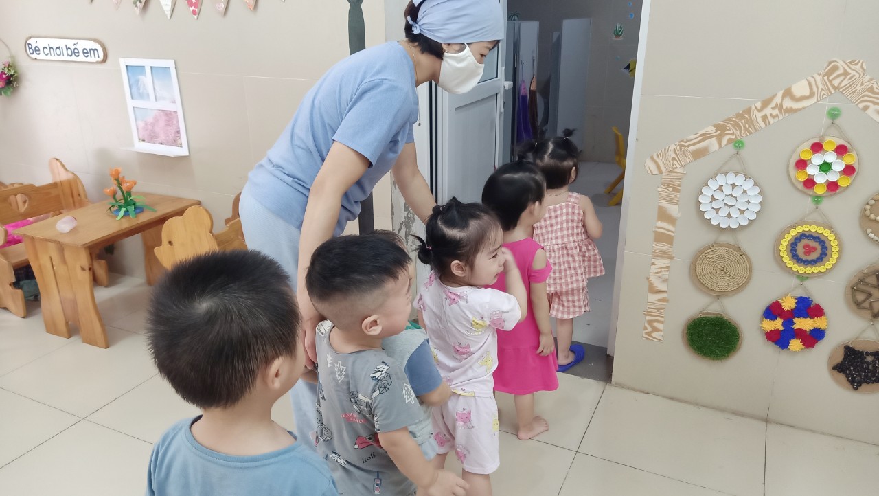 Cô !important; Hoà đang hướng dẫn các bé xếp hàng đi vệ sinh.