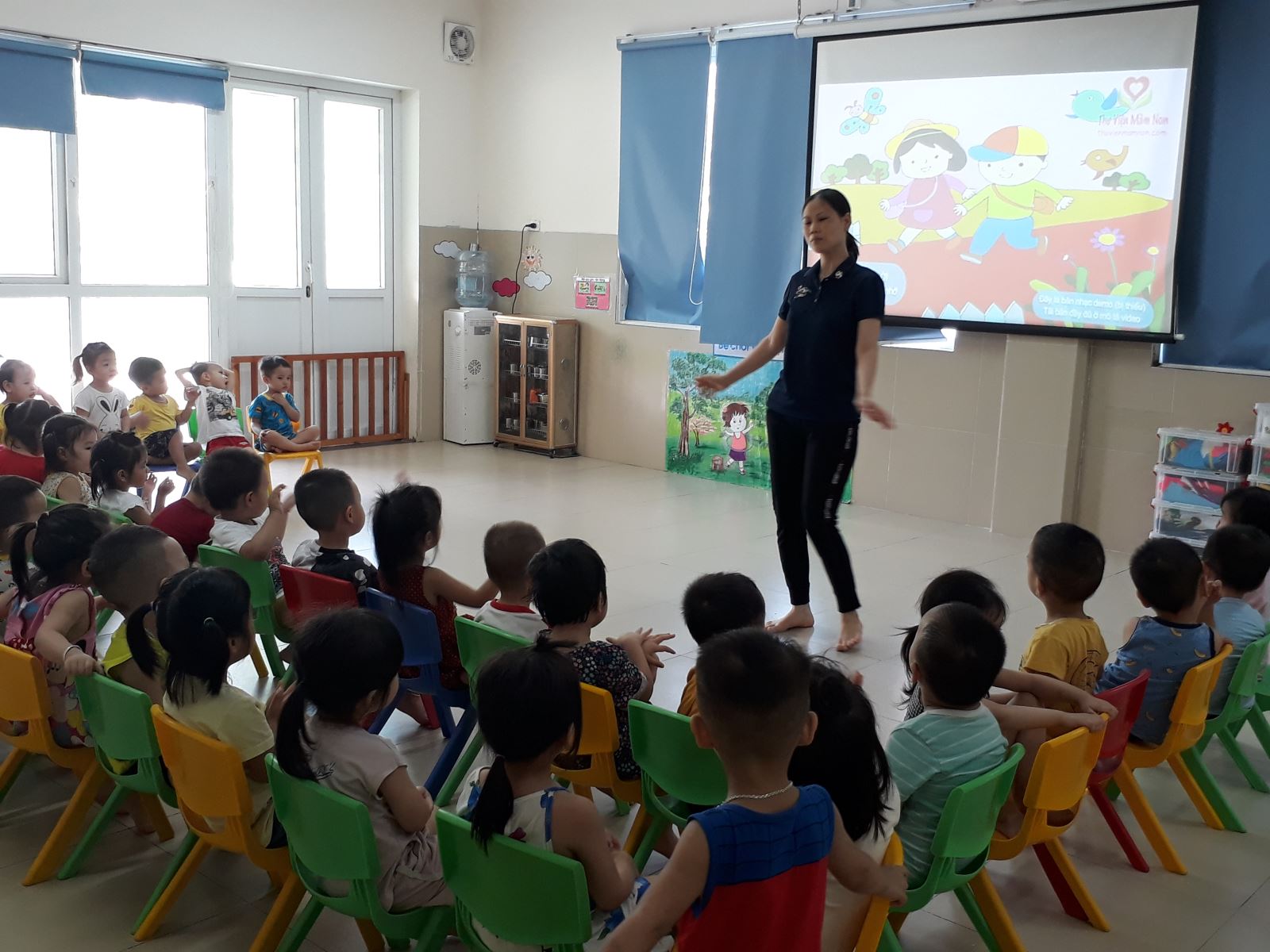 Với giờ học âm nhạc dạy hát: “Đường em đi”, nghe hát: “Đi đường em nhớ” của các bé lớp nhà trẻ D2, cô giáo luôn chú ý tạo tâm thế thoải mái cho trẻ trước khi vào bài học.