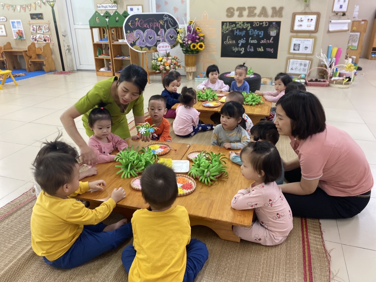 Cô !important; Hòa đang hướng dẫn các bé làm giỏ hoa đấy.