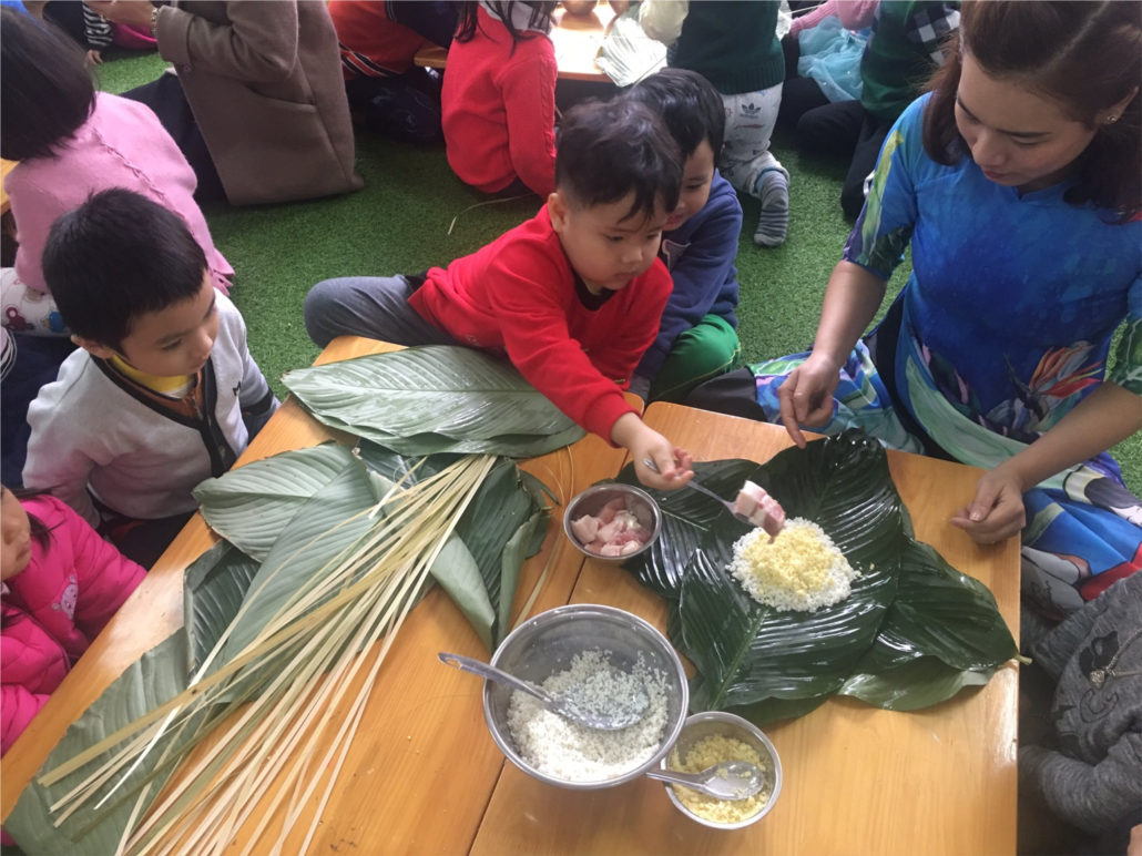 Các bé đang chăm chú xem cô Luyến gói bánh chưng đấy!