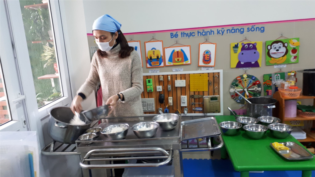 Giáo viên các lớp đang quan sát quy trình chioa cơm cho trẻ