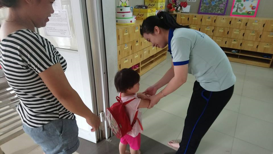 Mẹ đưa bé đến cửa bé khoanh tay chào cô