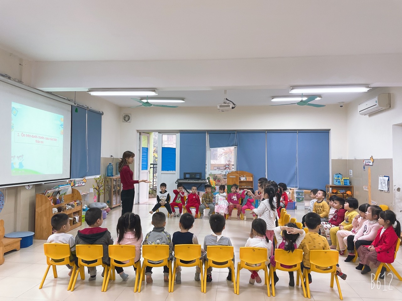 Đến với giờ học hôm nay, các bé được học bài “Xác định vị trí của đồ vật so với bản thân trẻ” trẻ xác định được vị trí của các đồ vật ở các phía khác nhau, Có kĩ năng liên hệ với thực tế xung quanh. Sau đó, trẻ còn được tham gia vào các trò chơi vui nhộn, bằng phương pháp học mà chơi, chơi mà học như vậy trẻ tiếp thu kiến thức một cách tự nhiên, không gò bó, làm tăng thêm vốn hiểu biết của trẻ, đồng thời trẻ thể hiện vốn hiểu biết giúp giáo viên lựa chọn nội dung, củng cố kiến thức phù hợp với khả năng của trẻ.