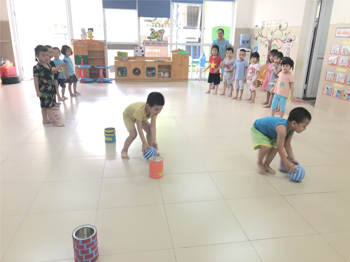 Các bé đang thực hiện lăn bóng theo đường zích zắc