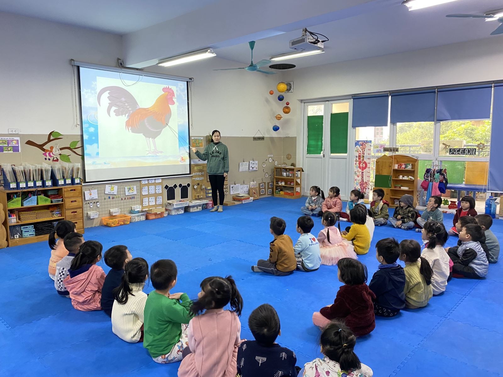 Cô và trẻ cùng nhau hát bài " Gà trống, meo con và cún con"