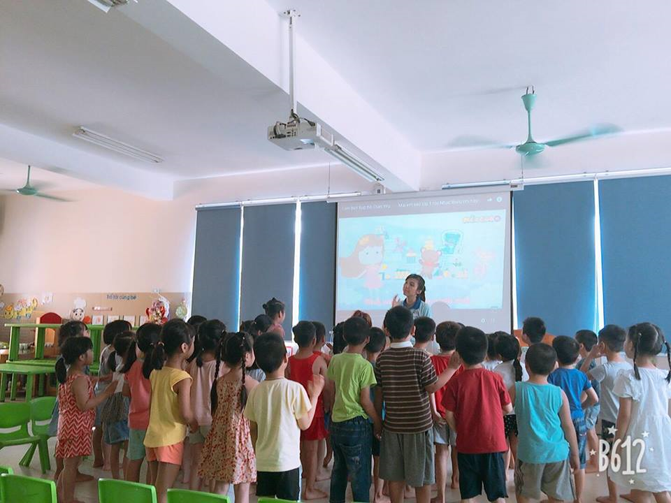 Cô và các bạn nhỏ đang hát và vận động theo nhạc