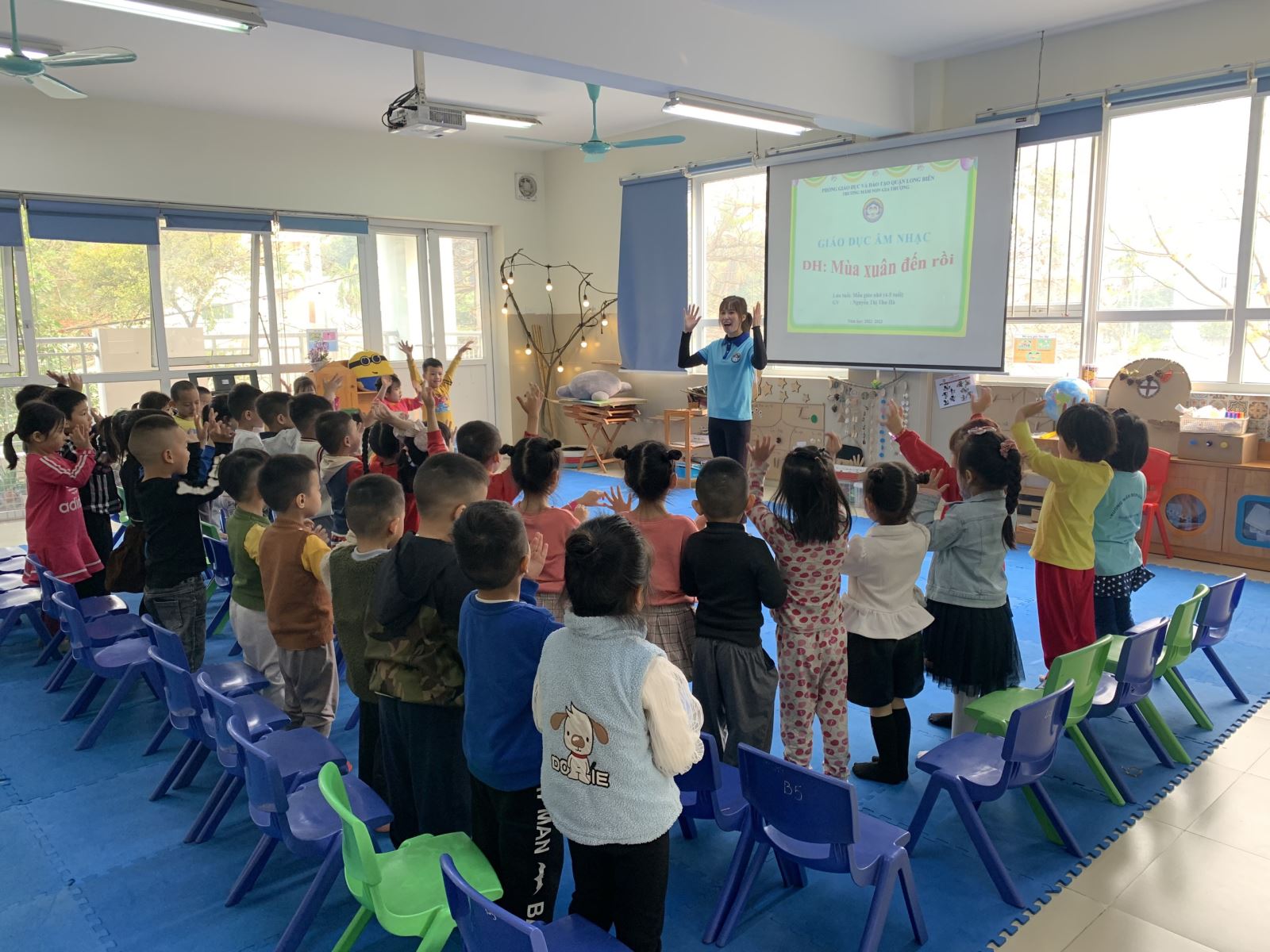 Kĩ năng cảm thụ âm nhạc của trẻ tương đối tốt, bé hưởng ứng và lắc lư theo giai điệu bài hát: "Mùa xuân nho nhỏ", một số bạn thuộc bài cũng hăng hái hát theo làm không khí lớp học trở lên sôi nổi hơn.