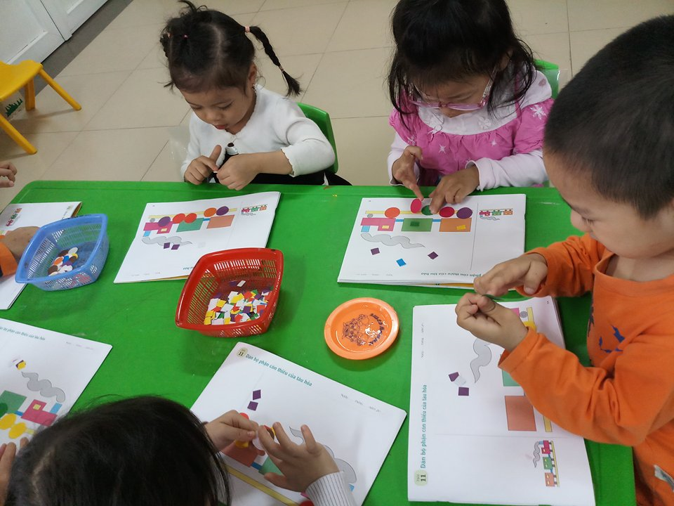 Chúng tớ được các cô hướng dẫn kĩ năng xếp thử, chấm hồ từ tăm bồng và dán sao cho đẹp mắt. Cùng chúng tớ dán bộ phận còn thiếu của tàu hỏa và xem thành quả của chúng tớ nhé!