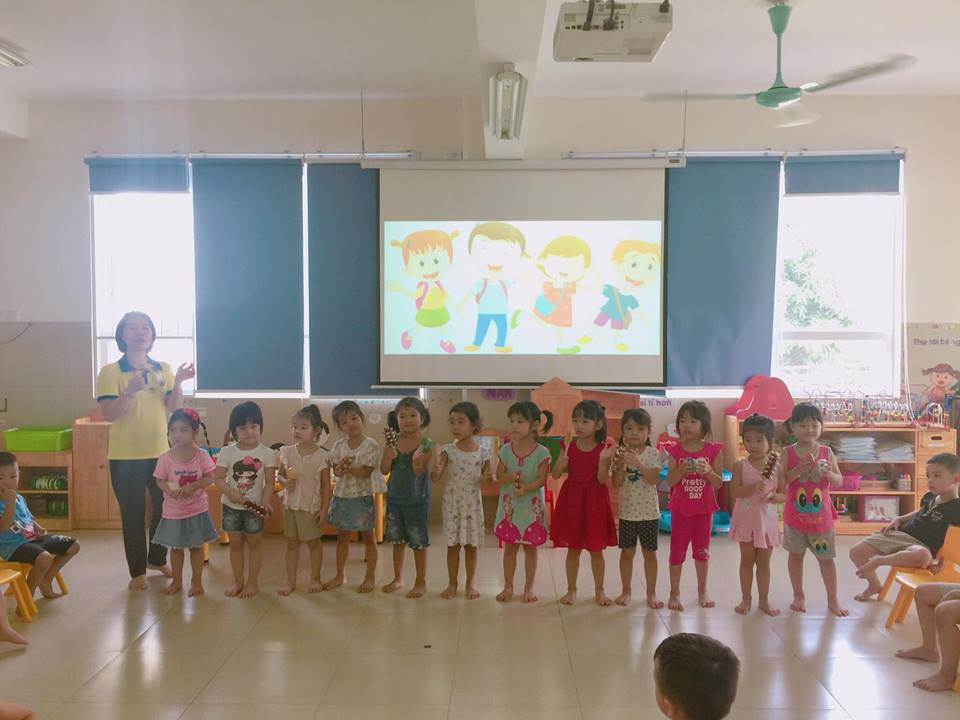 Cô gọi từng nhóm trẻ lên hát và biểu diễn với dụng cụ âm nhạc