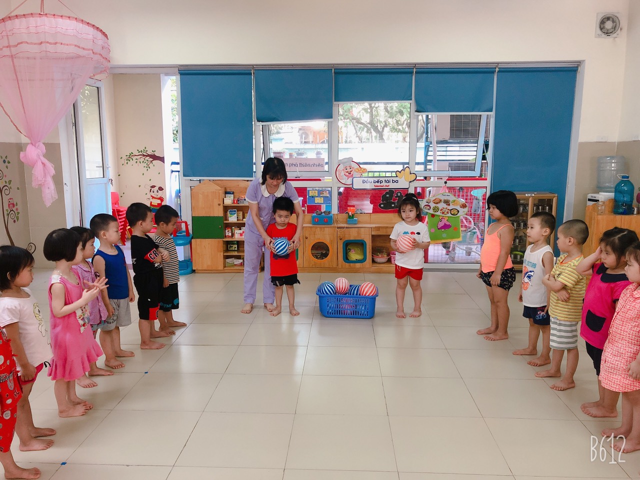 !important; Ở trường Mầm non ngoài giờ thể dục sáng ra thì mỗi tuần các bé đều được tham gia một giờ học GDTC với những bài tập khác nhau để giúp bé phát triển các vận động từ thô đến vận động tinh. Với mục đích yêu cầu đặt ra là trẻ biết cách cầm bóng bằng 2 tay và tung lên cao giúp phát triển cơ tay, chân, rèn tính nhanh nhẹn, khéo léo, phản xạ nhanh cho trẻ, rèn luyện tính kỷ luật, tinh thần tập thể hôm nay các cô giáo lớp MGB C3 đã tổ chức cho các bé tham gia giờ GDTC: Tung bóng lên cao bằng hai tay. Sau đây là một số hình ảnh của giờ học