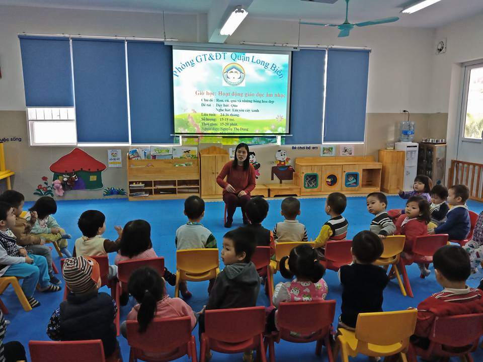 Hôm nay, các bạn nhỏ lớp nhà trẻ D1 được tham gia giờ học giáo dục âm nhạc: Dạy hát: " Quả". Nghe hát:" Em yêu cây xanh". Trước khi tham gia hoạt động, cô và trẻ chơi trò chơi " Gieo hạt", bạn nào cũng phấn khởi, thích thú.