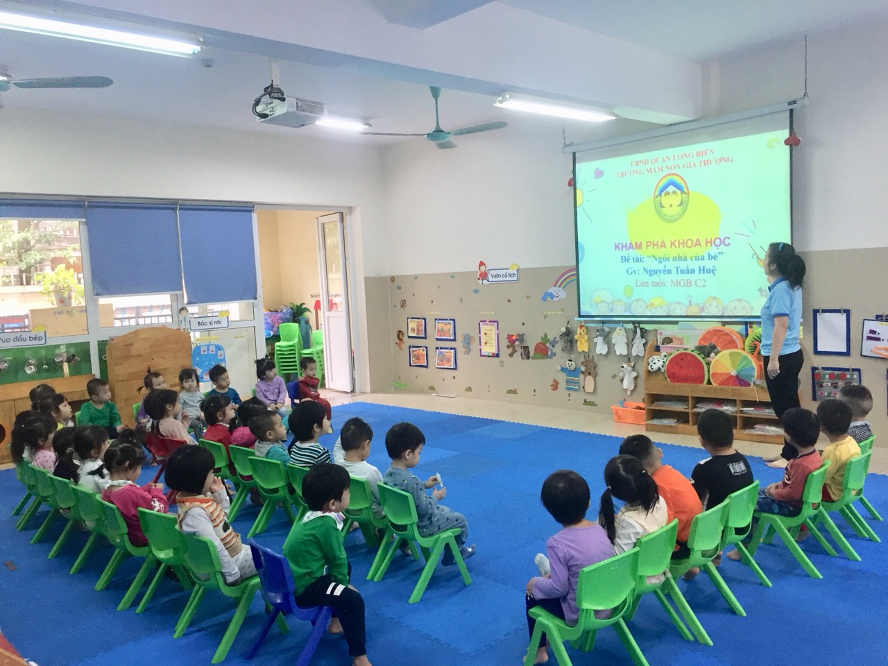 nghe, nhìn và vận động bằng đôi tay và đôi chân của mình.Tất cả những cử chỉ đó đều làm nên những thói quen, kể cả thói xấu. Muốn được như vậy, ngay từ tuổi ấu thơ trẻ mầm non, đặc biệt là trẻ mầm non đang ở những bước phát triển mạnh về nhận thức, tư duy, về ngôn ngữ, về tình cảm.Những thế giới khách quan xung quanh thật bao la, rộng lớn, có biết bao điều mới lạ, hấp dẫn, và còn có bao lạ lẫm khó hiểu, trẻ tò mò muốn biết, muốn được khám phá, cho nên giáo dục mầm non đã góp phần không nhỏ vào việc giáo dục thế hệ trẻ. Chính vì vậy hôm nay, cô và trò lớp MGB C2 cùng nhau học khám phá "ngôi nhà của bé". Dưới đây là 1 số hình ảnh của tiết học: