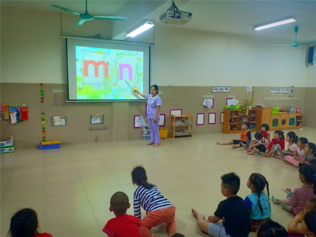 Sau khi được cô dạy nhận biết và phát âm, so sánh chữ, các bé được cô tổ chức trò chơi vận động kết hợp nhận biết chữ để củng cố kiến thức.