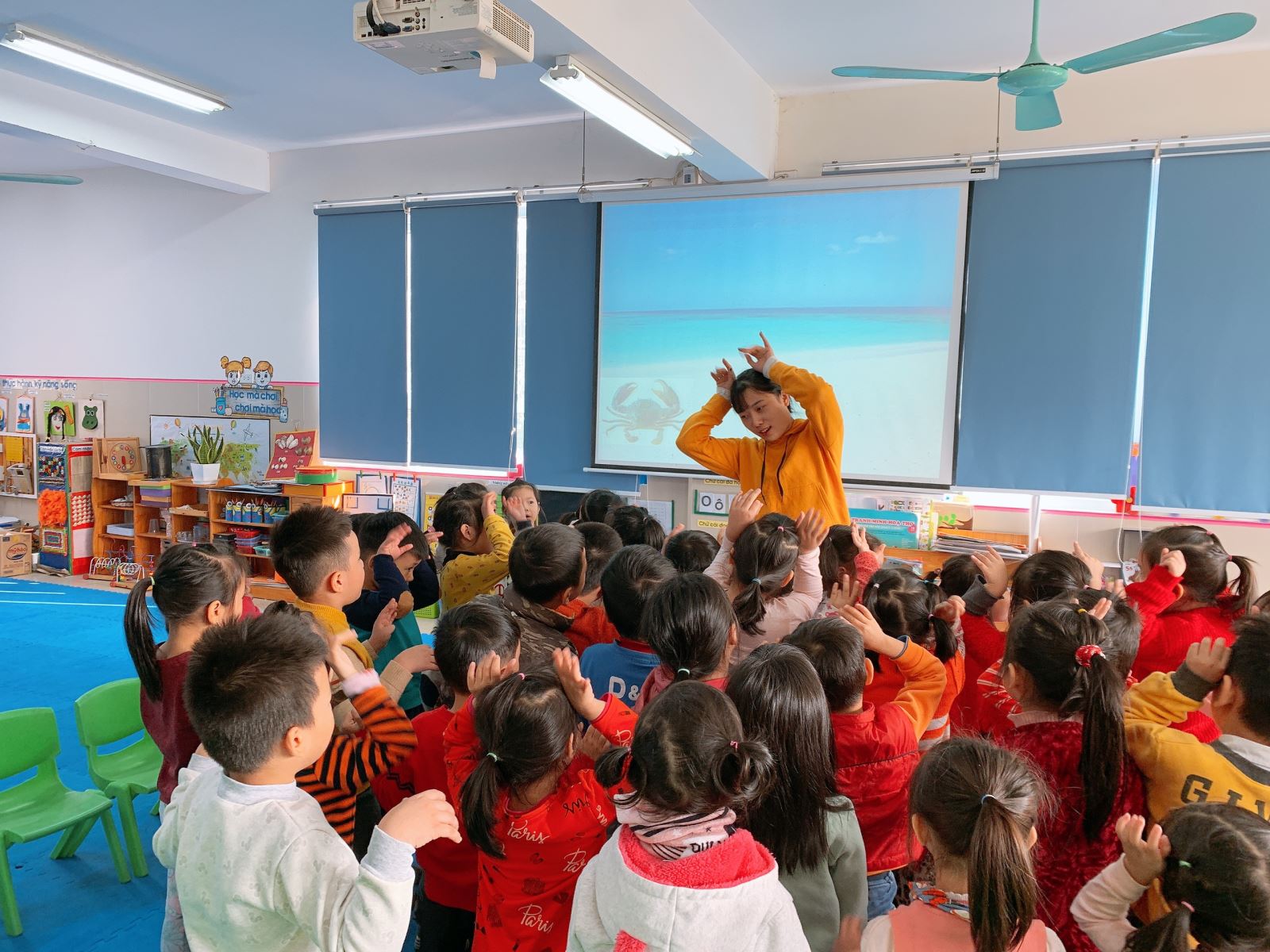 Hôm nay, lớp MGL A3 được cô Duyên dạy bài đồng dao “Con cua mà có 2 càng”