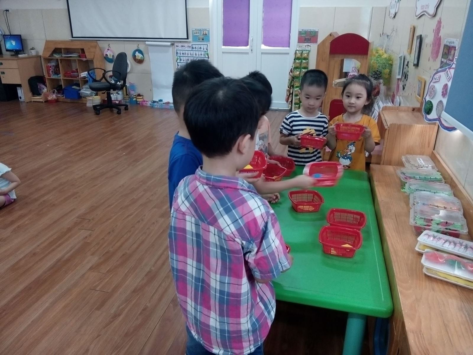Các bạn đang đi lấy rổ đồ dùng