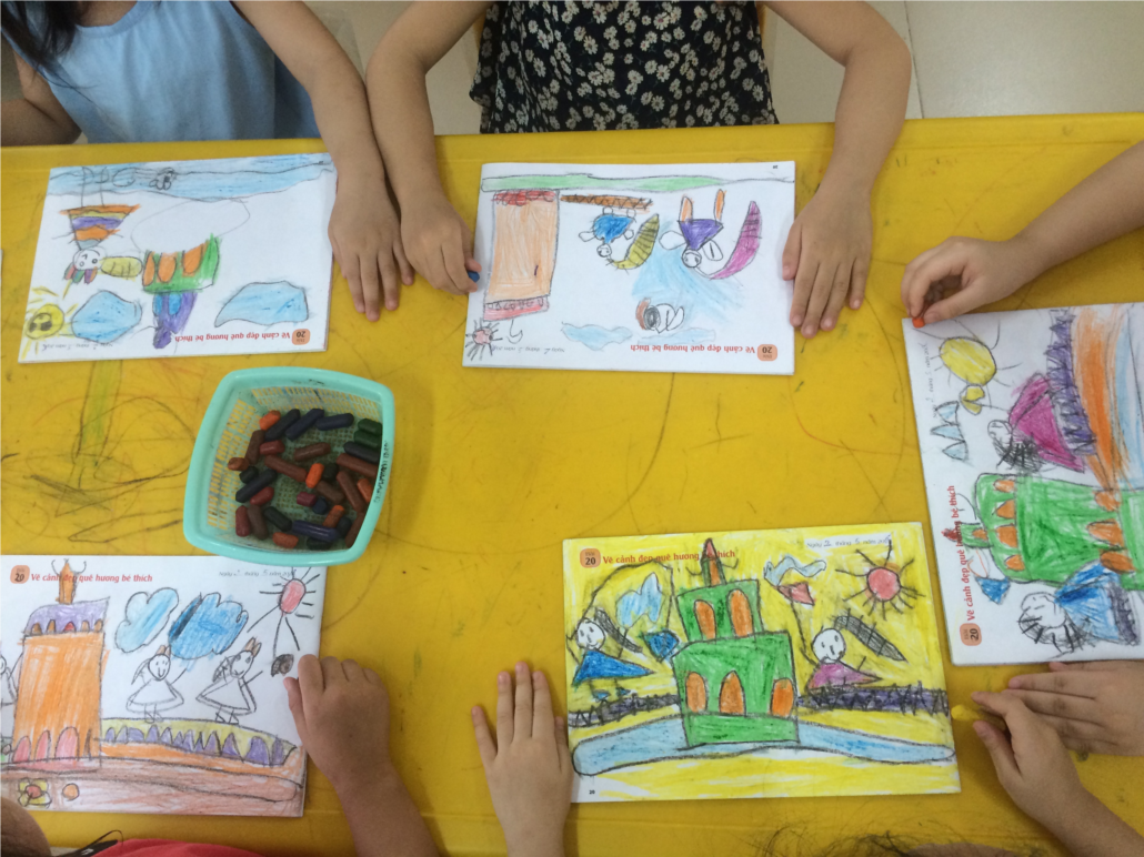 Cùng với sự thích thú, sáng tạo, các bé đã hoàn thành bức tranh quê hương xinh đẹp của mình, bạn vẽ núi non, bạn lại cảnh biển, bạn khu vui chơi, bạn thì sông nước. Đó cũng là niềm vui, là mơ ước của bé được trải nghiệm, khám phá những vùng đất mới.