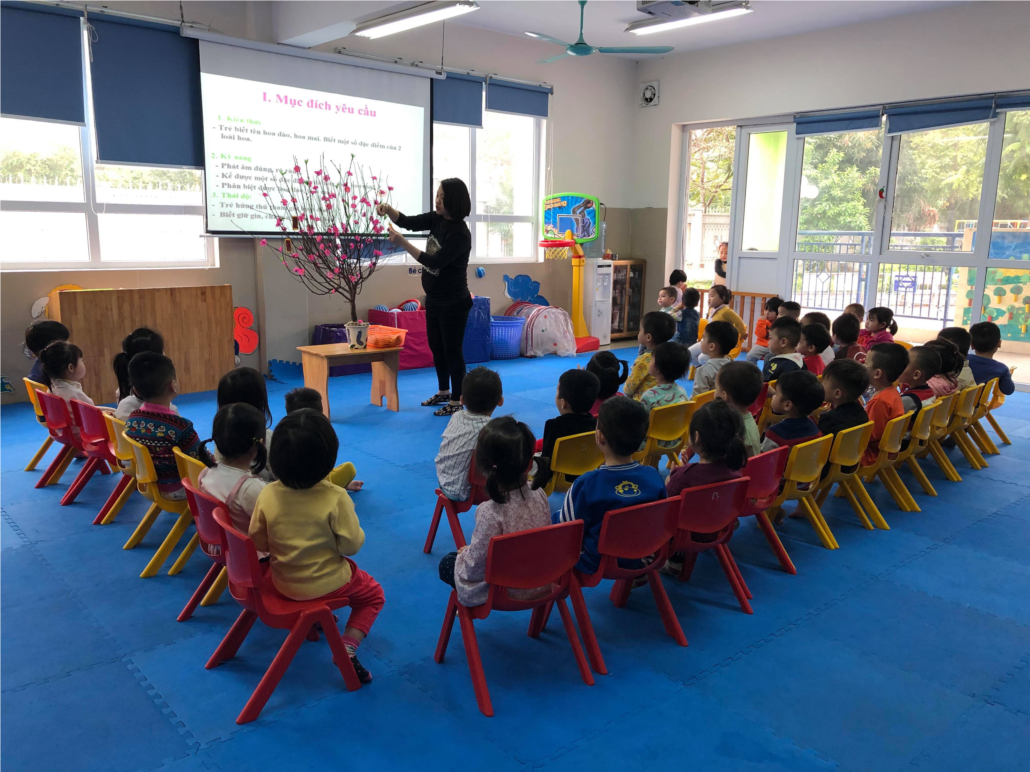 Cô giới thiệu với trẻ về những đồ vật được trang trí trên cây hoa đào.