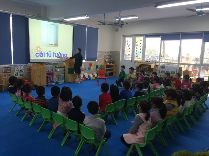 Mở đầu giờ học, cô Trang đã mang đến 1 câu đố rất hay về cái tủ tường, tuy mới đầu các bạn nhỏ A3 còn hơi nhầm lẫn 1 chút nhưng các bạn ý cuối cùng cũng trả lời được là cái tủ tường rồi đấy. Sau đó, cô mời 1 bạn lên tìm chữ cái đã học trong từ " cái tủ tường" và giờ học " Làm quen chữ cái u, ư" bắt đầu: