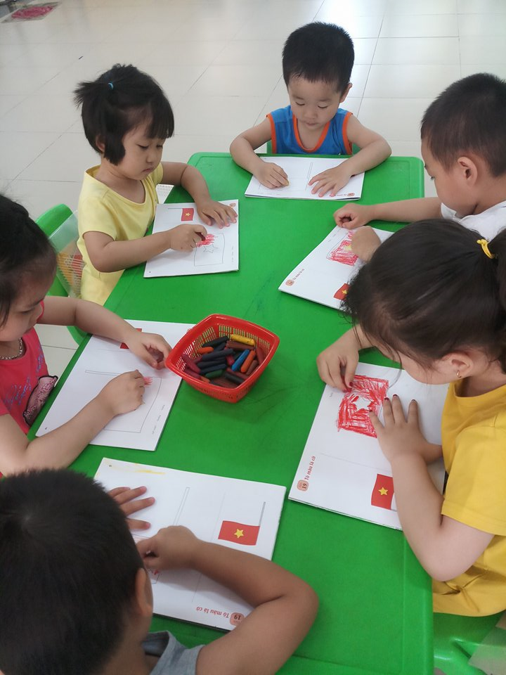 Các bạn khác đang chăm chú tô màu lá cờ