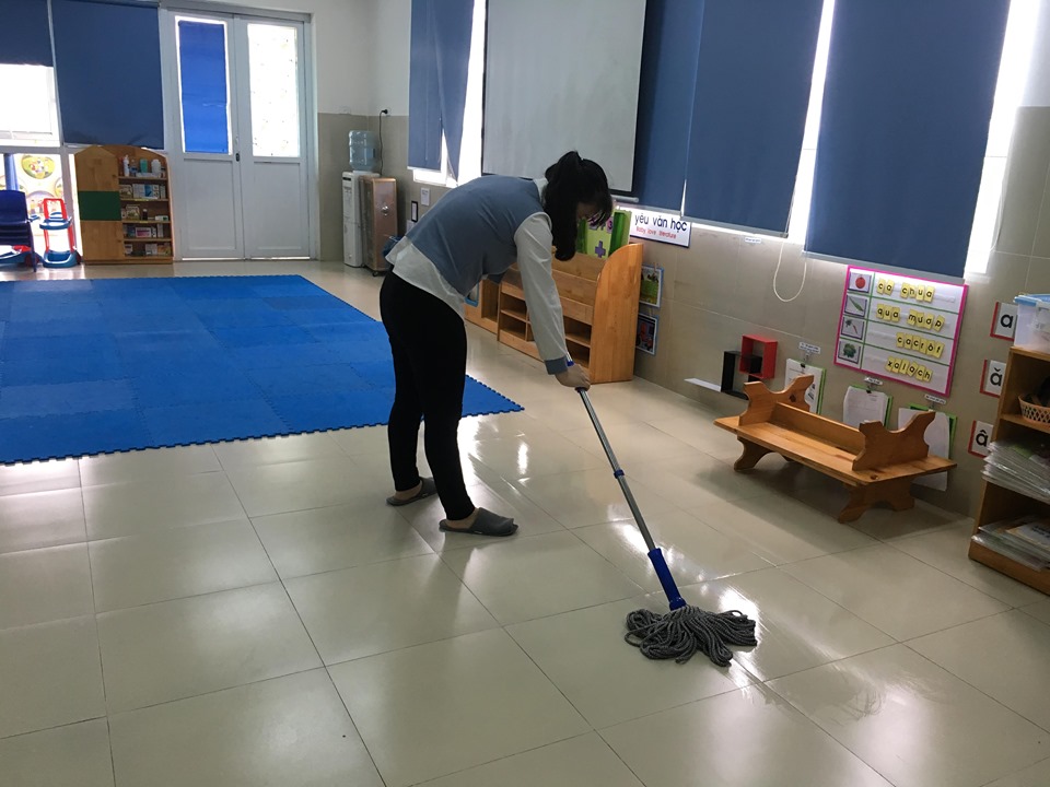 Khô !important;ng chỉ dọn dẹp trong lớp học, mà các cô còn dọn vệ sinh xung quanh sân trường, để đảm bảo vệ sinh và giúp cho sân trường Sáng - Xanh - Sạch - Đep.