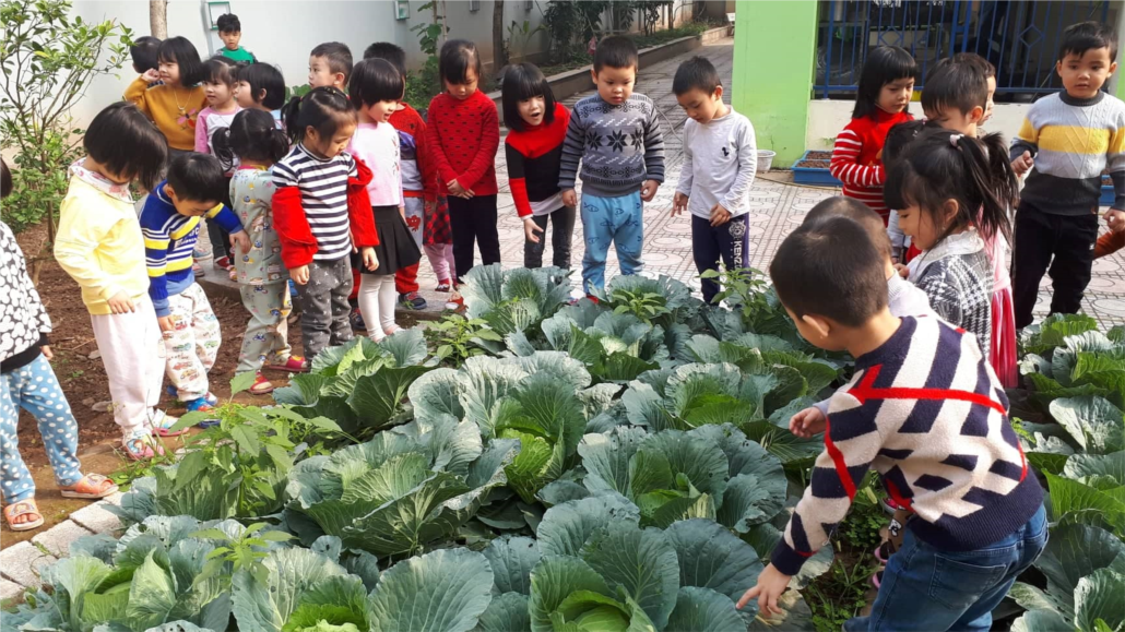 Các bạn nhỏ cùng nhau quan sát vườn rau Bắp cải.