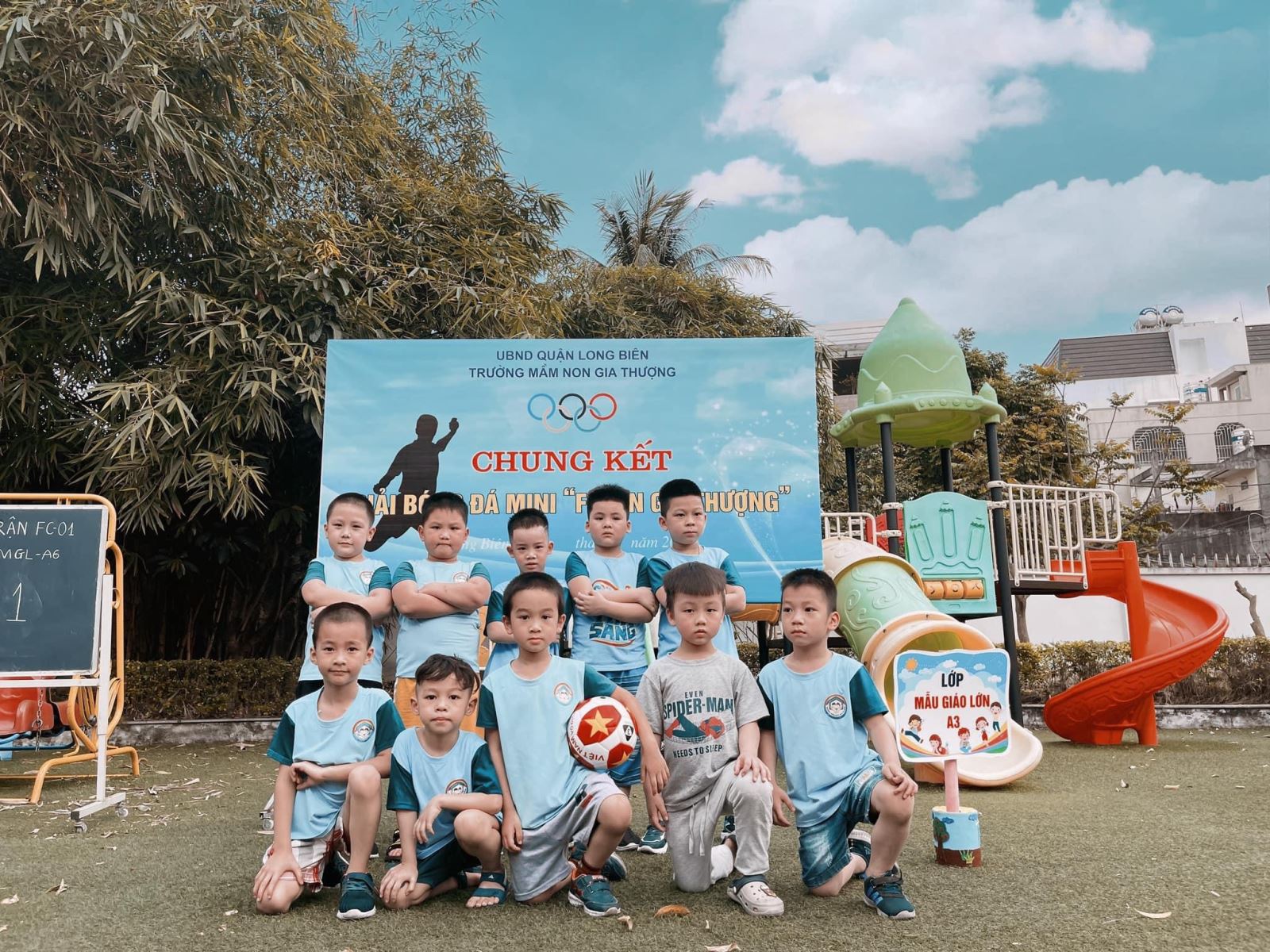 Cá !important;c cầu thủ nhí trong màu áo xanh của Trường mầm non Gia Thượng.
