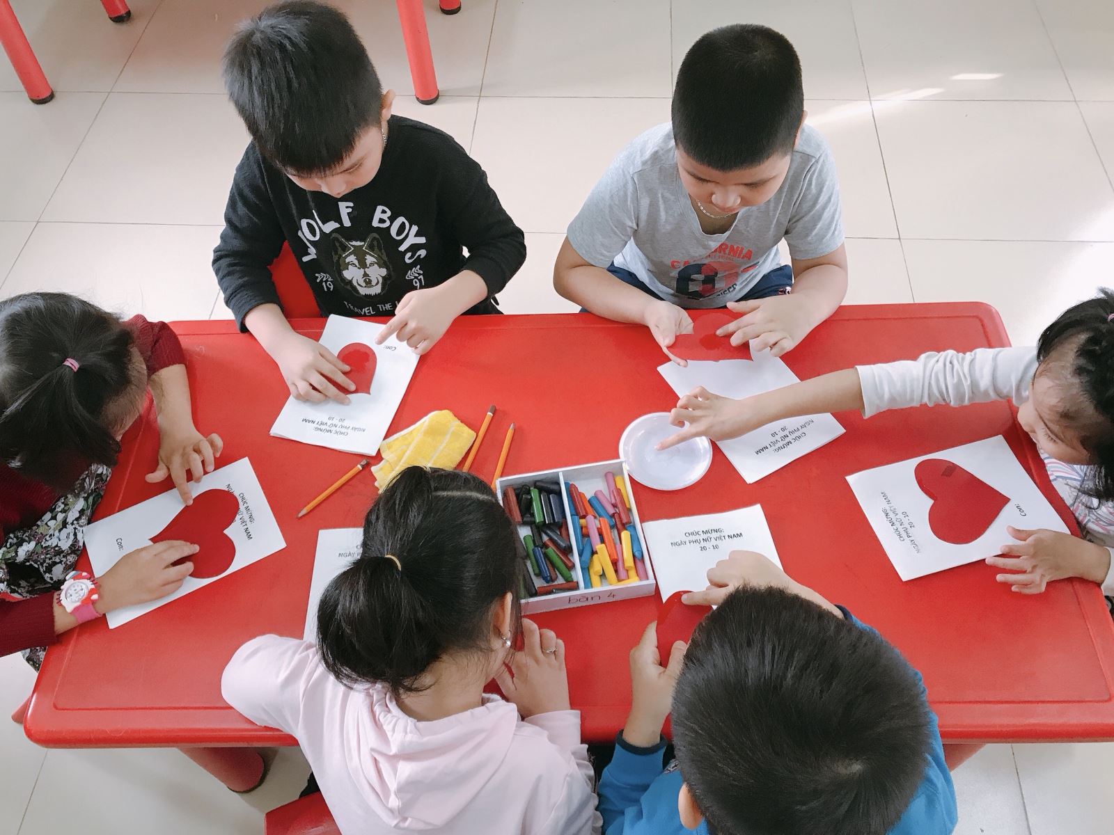 Các bạn nhỏ đang làm thiệp tặng bà và tặng mẹ đấy