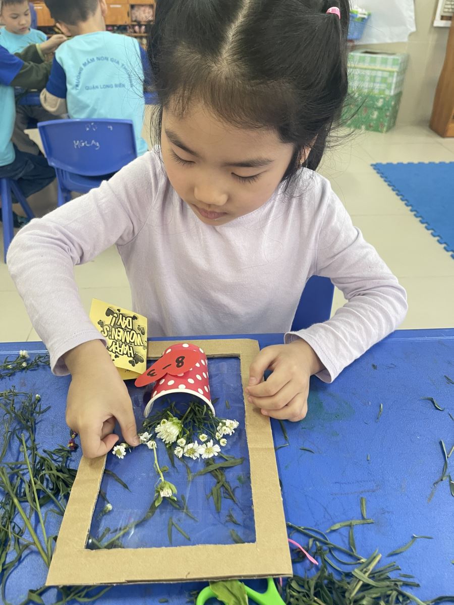 Các bé sẽ tự tay cắt những bông hoa mà mình yêu thích rồi dán lên nền băng dính.