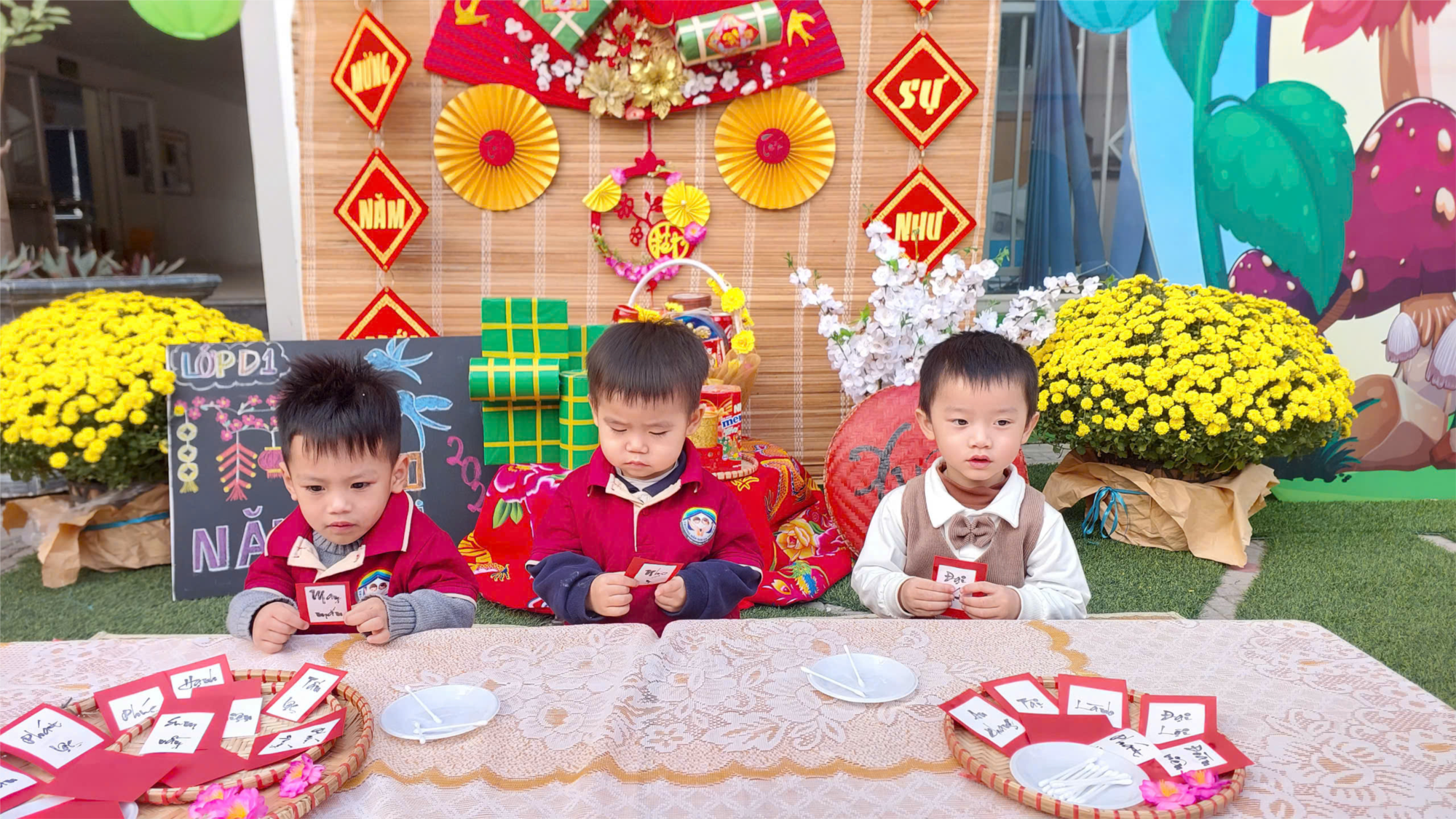 Bạn Khoa, Dần , Đăng đang trang trí câu đối ngày Tết.