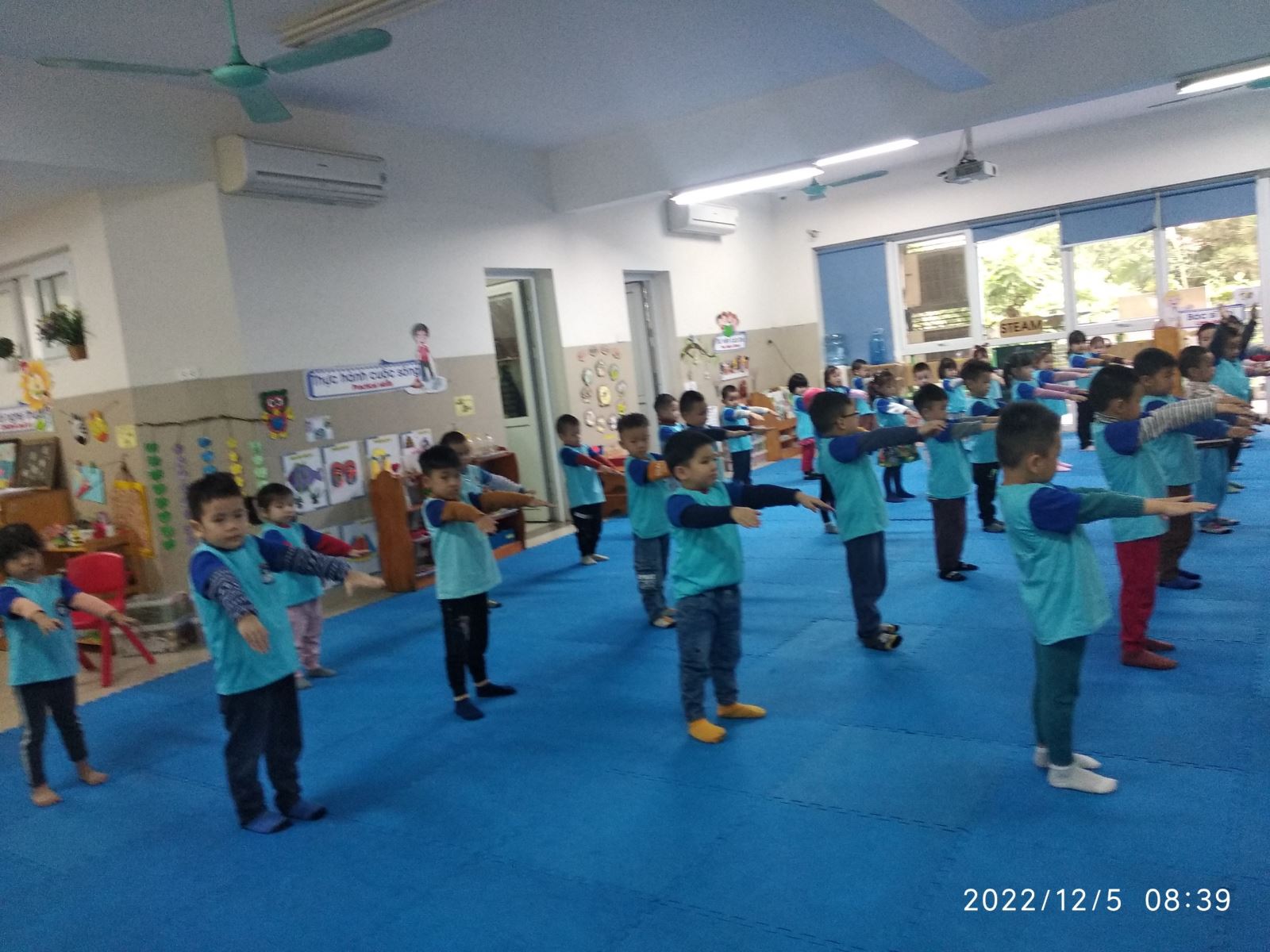 Giáo dục thể chất cho trẻ mầm non là hình thức giáo dục tác động nhiều mặt đến cơ thể của trẻ em, tiến hành tổ chức cho trẻ vận động và sinh hoạt khoa học nhằm bảo vệ, giúp cơ thể trẻ được khỏe mạnh, phát triển hài hòa và cân đối. Điều này, tạo cơ sở cho sự phát triển toàn diện của bé trong tương lai. Các tiết học thể dục hằng ngày được xem là hình thức giáo dục thể chất có mục đích và kế hoạch cụ thể, giúp định hướng sự phát triển vận động cho bé. Các bài tập thể dục đơn giản sẽ giúp trẻ phát triển khả năng vận động từ tự do, rời rạc sang vận động một cách chủ động, biết cách phối hợp các động tác trong bài thể dục một cách nhịp nhàng. Ngoài ra, các hoạt động thể chất còn có tác động tích cực đến hoạt động sinh lí bên trong cơ thể. Khi cơ bắp của bé hoạt động sẽ giúp tăng cường quá trình trao đổi chất, giúp hệ tuần hoàn, hệ hô hấp làm việc tốt hơn. Chính vì điều đó nên cô và trò lớp B1 đã chăm chỉ rèn luyện và vận động thường xuyên tập thể dục giúp cơ thể khỏe mạnh: