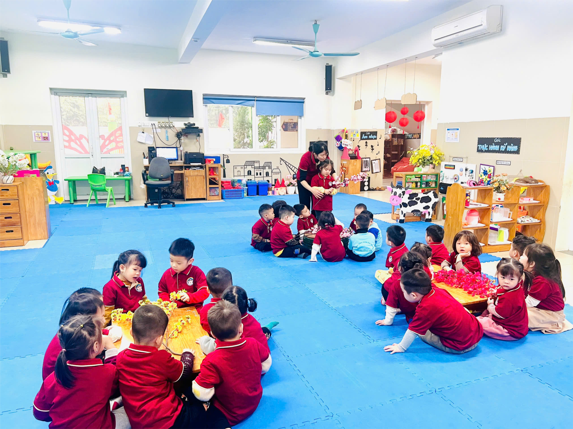 Khám phá khoa học là môn học trẻ rất yêu thích bởi qua môn học này trẻ được tìm tòi, khám phá trải nghiệm, suy đoán, phát biểu những điều mới mẻ xung quanh trẻ. Trong giờ học khám phá các loài hoa đặc trung mùa xuân, các bạn nhỏ lớp C2 được cùng nhau khám phá các loài hoa “Hoa đào, Hoa mai”, 2 loài hoa đặc trung rõ nét nhất của mùa xuân đại diện cho 2 miềm Bắc, Nam. Với sự hướng dẫn của giáo viên các bạn nhỏ rất hứng thú trải nghiệm dưới hình thức “Học mà chơi- Chơi mà học”. Với hình thức lấy trẻ làm trung tâm giáo viên chỉ dẫn, gợi mở giúp trẻ tự suy nghĩ, phán đoán đưa ra câu trả lời theo ý hiểu của riêng mình. Với tiêu đề khám phá “ Các loài hoa đặc trung mùa xuân” trẻ biết được các đặc điểm, màu sắc, hương thơm, ích lợi và cách chăm sóc và bảo vệ cây hoa.